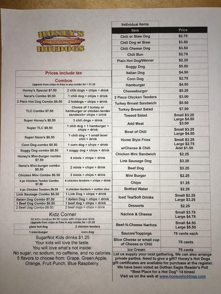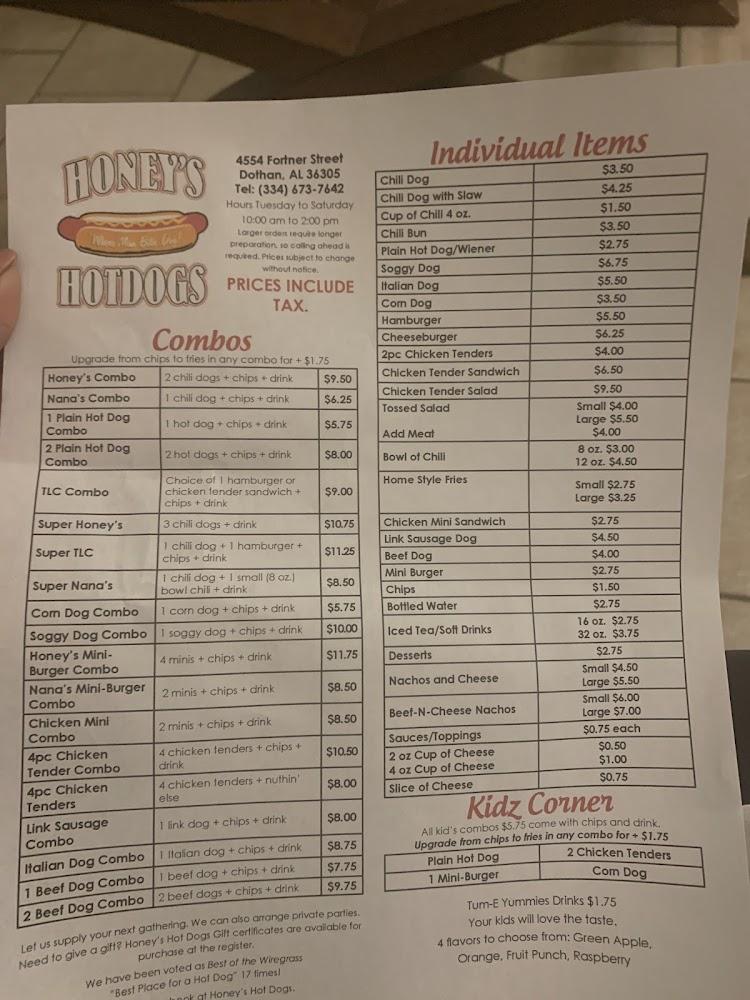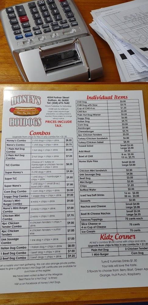 Welcome to Honey's Hotdogs, your ultimate destination for delicious gourmet hot dogs in Dothan, Alabama! Located at 4554 Fortner St, we offer a cozy and relaxed atmosphere perfect for solo diners, families, and groups. Enjoy a wide selection of local specialties, refreshing teas, and quick service, whether you dine in, opt for takeout, or enjoy our convenient drive-thru. With accessibility features, free Wi-Fi, and a kid-friendly menu, we accommodate everyone. Come savor our simple, traditional cuisine, where great flavor meets affordable prices. Join us for lunch or dinner and experience the comfort of Honey's Hotdogs!